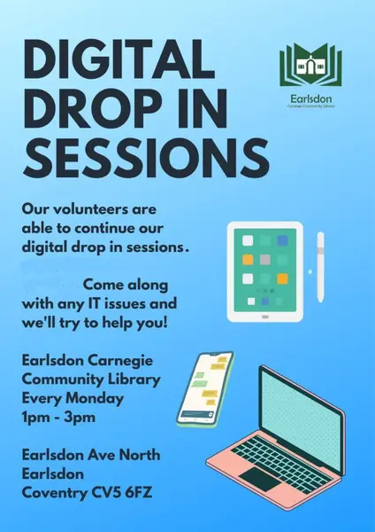 Regular drop-in sessions to help with digital skills at Earlsdon Carnegie Community Library.