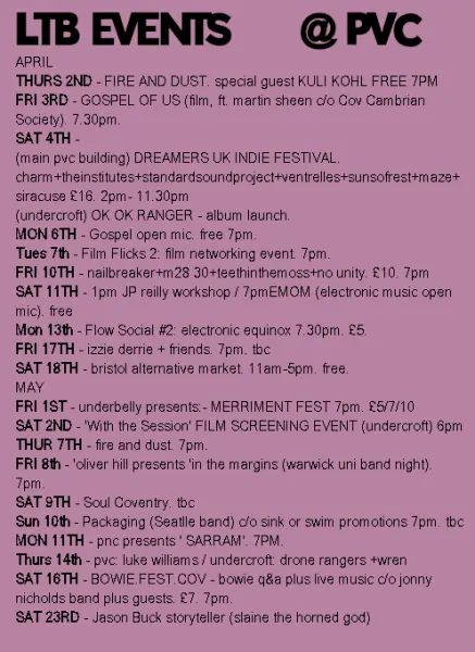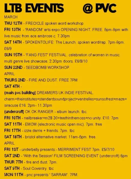 13The second Flow Social event, an 'Electronic Equinox' music night. Tickets are £5.